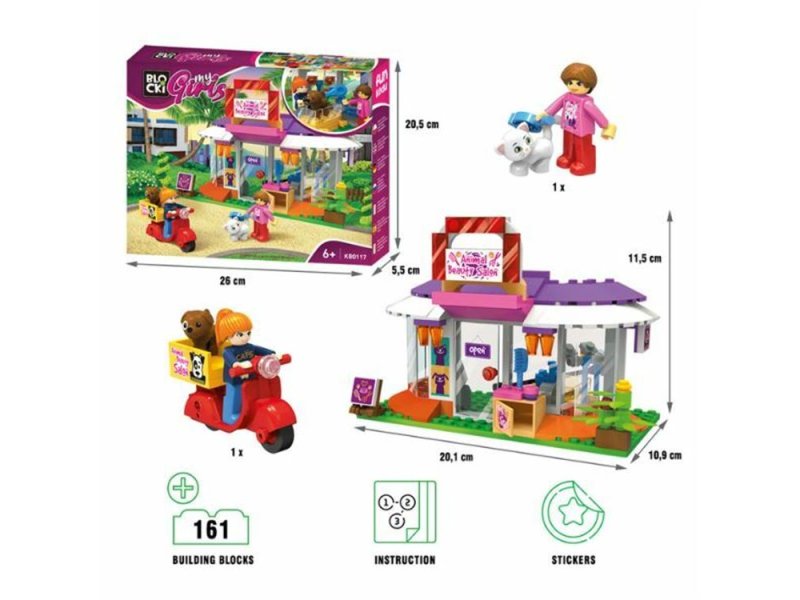 Blocki Kocke blocki Salon lepote za životinje sa dodacima sadrži ukupno 161 deo. U setu se nalaze različiti elementi koji omogućavaju deci da izgrade kompletan salon lepote za životinje. Pored osnovnih kocki, set uključuje i specijalne dodatke kao što su figurice životinja, nameštaj i dekorativni elementi, koji čine igru još zanimljivijom i realističnijom.