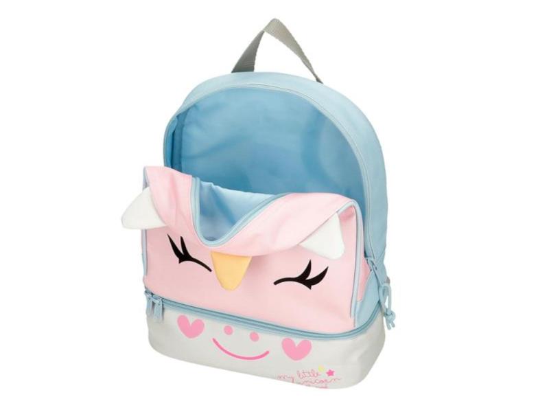Ranac ima prostran glavni odeljak sa rajsferšlusom u koji staje sve što dete treba da ponese tokom dana – užina, igračka, rezervna garderoba ili sitnice koje želi da ima uz sebe. Sa obe strane nalaze se mrežasti džepovi, idealni za flašicu vode, kišobran ili manje dodatke koje treba brzo dohvatiti. Široki, ergonomski i postavljeni kaiševi ravnomerno raspoređuju težinu i obezbeđuju udobno nošenje, čak i tokom dužih šetnji ili aktivnog dana.