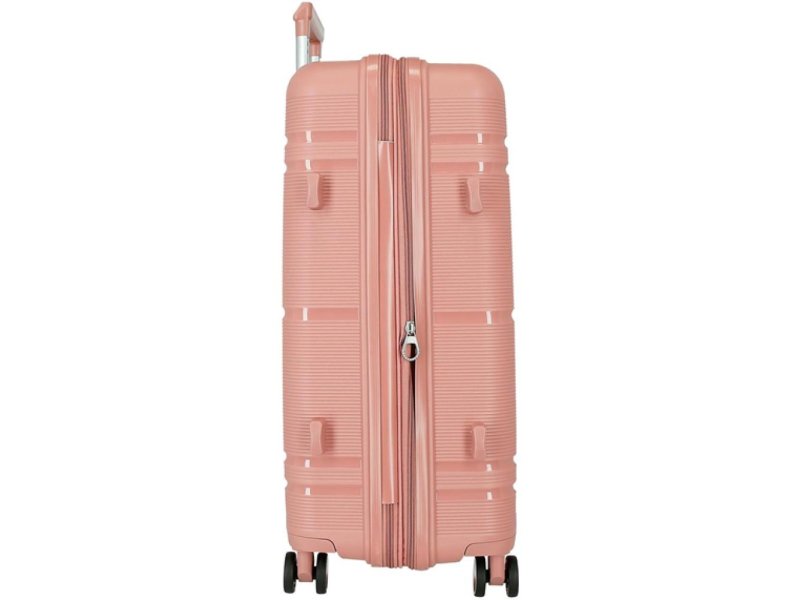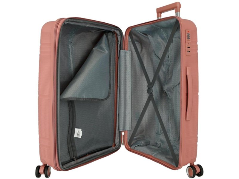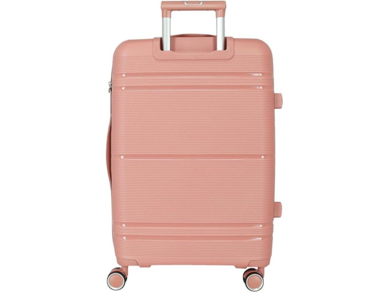 | Karakteristike | Komplet od dva kofera: srednji i kabinski (mali) Kolekcija: Universe Boja: puder-roze Materijal: polipropilen Četiri rotirajuća točkića sa ojačanjima na oba kofera Teleskopska ručka na oba kofera Ručke za nošenje u ruci, na srednjem koferu bočno i gore, na kabinskom gore Sigurnosna TSA bravica za zaključavanje na oba kofera Zakopčavanje rajsferšlusom oba kofera Nožice na srednjem koferu, bočno Oba kofera u unutrašnjosti: jedna strana sa elastičnim trakama, a druga sa poklopcem koji se zakopčava rajsferšlusom, na poklopcu je mrežasti džep sa rajsferšlusom Prilikom odlaganja, moguće je spakovati mali kofer u srednji |