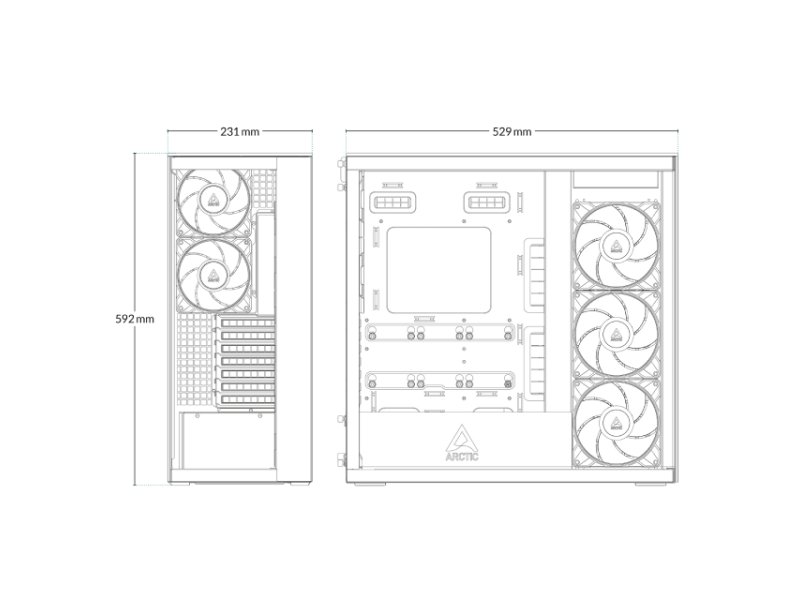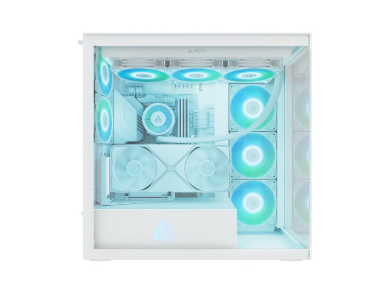 | Karakteristike | Podržane ploče: E-ATX (maksimalna širina 285 mm), ATX, Micro-ATX, Mini-ITX Maksimalna visina hladnjaka za procesor: 171 mm Maksimalna dužina grafičke kartice: 482 mm (bez bočnog radijatora) Maksimalna dužina napajanja: 318 mm (do 200 mm uz HDD kavez) Broj PCI slotova: 7 Materijal: čelik, kaljeno staklo Bočni panel: kaljeno staklo Boja: bela Ugrađeni ventilatori: 3× P14 Pro Reverse A-RGB (bočno), 2× P12 Pro A-RGB (pozadi) Filteri za prašinu: magnetni mrežasti filteri na vrhu i sa strane Prostor za kablove iza ploče: 3.5 cm Podrška za vertikalnu montažu grafičke kartice: da, uključuje PCIe Gen 4 riser kabl dužine 160 mm Podrška za vodeno hlađenje: prednji 240 / 280 / 360 / 420 mm, gornji 240 / 280 / 360 / 420 mm, zadnji 120 mm Podrška za ventilatore: prednji 3×120 ili 3×140 mm, gornji 3×120 ili 3×140 mm, zadnji 2×120 mm Podrška za diskove: 3× 2.5" iza ploče, 2× 3.5" ili 2.5" u kavezu + 1× 2.5" dodatni |