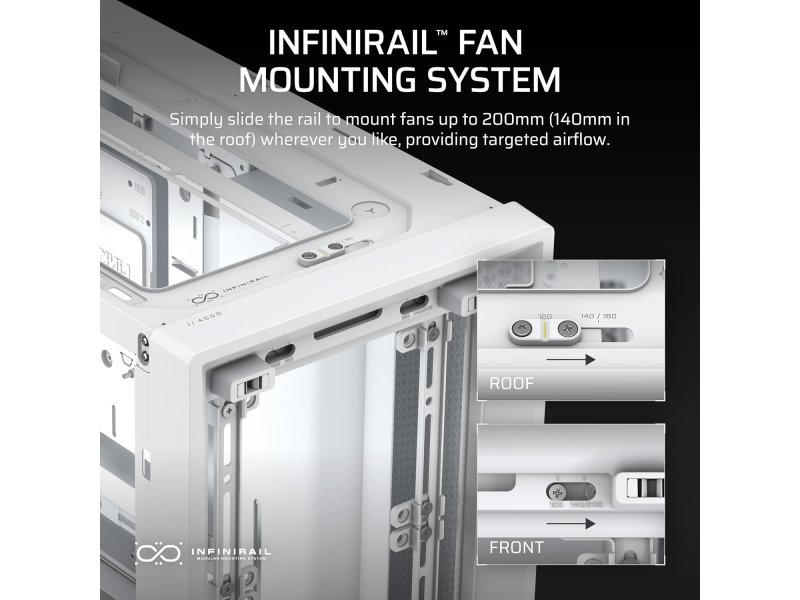 Karakteristike | Tip kućišta Mid-Tower Podržane ploče ATX, microATX, Mini-ITX Prozor Kaljeno staklo Napajanje Bez napajanja u paketu (PSU nije uključen) Materijal Čelik, kaljeno staklo, plastika Maksimalna dužina grafičke karte do 360 mm Maksimalna visina CPU hladnjaka do 170 mm Maksimalna dužina napajanja do 220 mm Podrška za ventilatore Prednji: do 3x 120 mm / 2x 140 mm Gornji: do 2x 120 mm / 2x 140 mm Zadnji: 1x 120 mm Preinstalirani ventilatori 2x 120 mm (AirGuide, 1x prednji, 1x zadnji) Podrška za radijatore Prednji: do 360 mm Gornji: do 280 mm Zadnji: 120 mm Filteri za prašinu Da, uklonjivi |