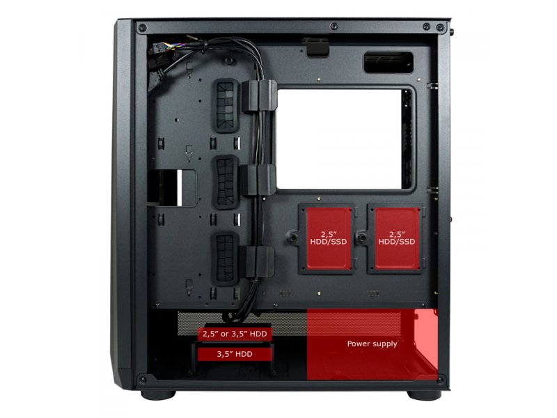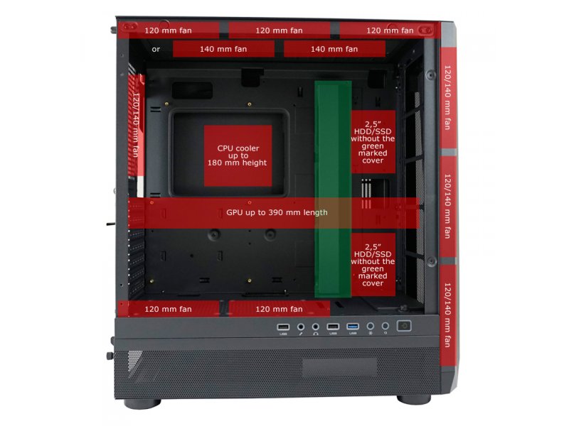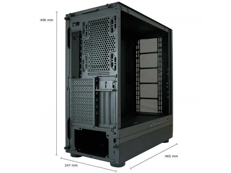 | Fizičke karakteristike | Materijal kućišta metalno kaljeno staklo plastika boja kućišta crna prednji panel crni mrežasti dizajn dimenzije kućišta VxŠxD 496x247x465mm dimenzija kaveza VxŠxD 480x225x410mm dimenzije pakovanja VxŠxD 550x300x585mm težina (maloprodaja) 9,14 kg |