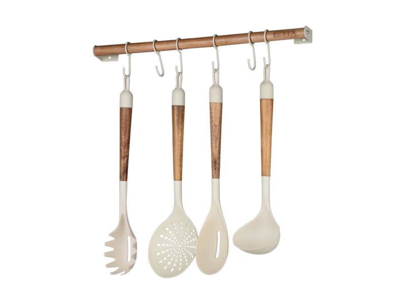 Zidni držač za kuhinju Estia ES02-34115 olakšava organizaciju kuhinjskog pribora i čini ga uvek dostupnim pri pripremi hrane. Napravljen je od kvalitetnog drveta, sa modernim dizajnom koji se lako uklapa sa ostalim kuhinjskim elementima. Zidni držač za kuhinju Estia ES02-34115 ima šest praktičnih kukica, idealnih za kašike, lopatice ili druge kuhinjske alate, a neutralna boja drveta/bež dopunjuje svaki enterijer. Dimenzije i kompaktan oblik omogućavaju jednostavno postavljanje na zid i štede prostor u kuhinji.