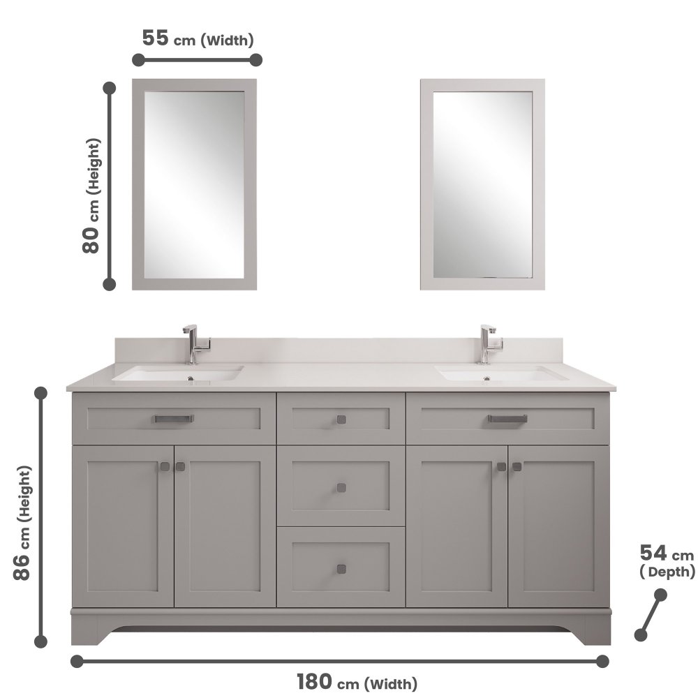 Specifikacija | 100% Lakirani MDF (Puno drvo) (Debljina: 18 mm) Radna ploča: %100 Beli kvarc I Porcelanski sudoper Fioka: 100% Morsko drvo (debljina: 12 mm) Flotal Mirror Chrome ručke Kupatilo: Širina: 180 cm cm Visina: 86 cm Dubina: 54 cm Ogledalo: Širina: 55 cm Visina: 80 cm |