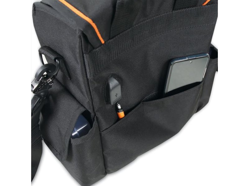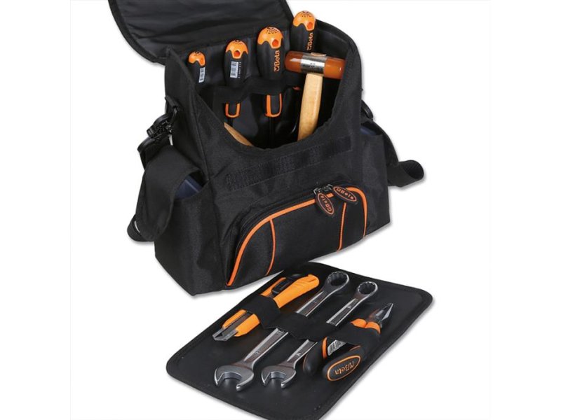 | Specifikacije | Torbica za alat, napravljena od tehničke tkanine Mini torba koju uvek nosite sa sobom! 1 spoljašnji prednji džep sa patent zatvaračem 2 bočna džepa 1 praktičan zadnji džep sa čičak trakom 1 unutrašnja ploča za alate koja se može ukloniti, sa elastičnim trakama sa obe strane USB interfejs za punjenje mobilnih uređaja U kompletu sa kaišem za rame Dimenzije: 330 x 320 x 150 mm Težina: 890 g Napomena: torba se isporučuje bez alata |