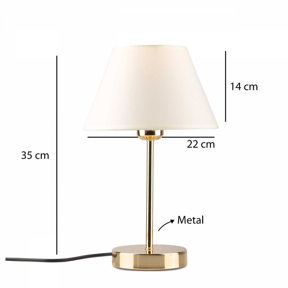 | Specifikacija | Stona lampa Materijal lampe: Metal Materijal abažura: PVC Dimenzije: Ukupna visina: 35 cm Prečnik abažura: 22 cm Visina abažura: 14 cm Dužina kabla: 150 cm Broj izvora svetlosti: 1 Tip sijaličnog grla: E27 Specifikacije osvetljenja: E27 1x max 40W Radni napon: 220-240 V IP zaštita: IP20 Napomena: Sijalica nije uključena u pakovanje |