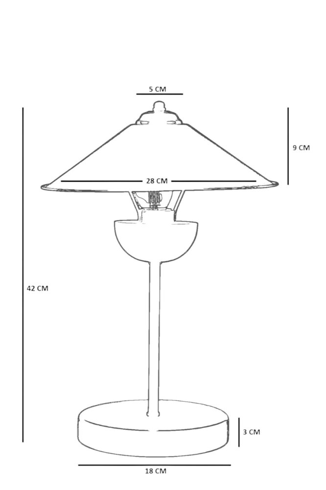 | Specifikacija | Stona lampa Materijal lampe: Metal Materijal abažura: Metal Dimenzije: Ukupna visina: 42 cm Prečnik abažura: 5-28 cm Visina abažura: 9 cm Prečnik baze: 18 cm Visina baze: 3 cm Dužina kabla: 100 cm Broj izvora svetlosti: 1 Tip sijaličnog grla: E27 Specifikacije osvetljenja: E27 1x max 40W Radni napon: 220-240 V IP zaštita: IP20 Tip prekidača: Dugme za uključivanje/isključivanje na kablu Napomena: Sijalica nije uključena u pakovanje |