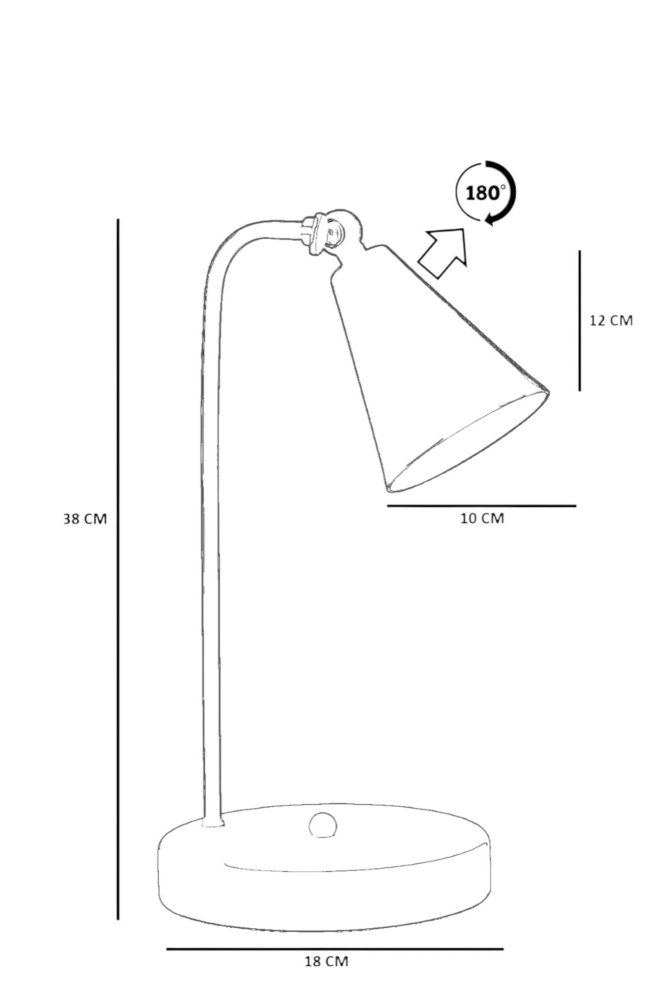 | Specifikacija | Stona lampa Materijal lampe: Metal Materijal abažura: Metal Dimenzije: Ukupna visina: 38 cm Prečnik abažura: 10 cm Visina abažura: 12 cm Prečnik baze: 18 cm Visina baze: 3 cm Dužina kabla: 100 cm Broj izvora svetlosti: 1 Tip sijaličnog grla: E27 Specifikacije osvetljenja: E27 1x max 40W Radni napon: 220-240 V IP zaštita: IP20 Tip prekidača: Dugme za uključivanje/isključivanje na kablu Napomena: Sijalica nije uključena u pakovanje |