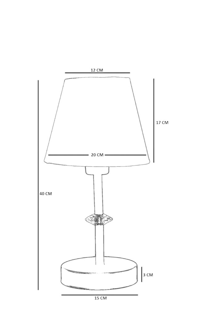 | Specifikacija | Stona lampa Materijal lampe: Metal Materijal abažura: Tekstil Dimenzije: Ukupna visina: 40 cm Prečnik abažura: 12-20 cm Visina abažura: 17 cm Prečnik baze: 15 cm Visina baze: 3 cm Dužina kabla: 100 cm Broj izvora svetlosti: 1 Tip sijaličnog grla: E27 Specifikacije osvetljenja: E27 1x max 40W Radni napon: 220-240 V IP zaštita: IP20 Tip prekidača: Dugme za uključivanje/isključivanje na kablu Napomena: Sijalica nije uključena u pakovanje |