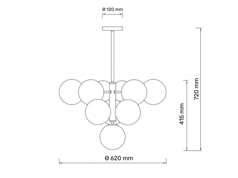 | Karakteristike | Artikal Luster Model / tip TALIA 13 Nazivni napon 220-240V AC / 50/60Hz Tip grla G 9 Broj grla 10 Izvor svetlosti Sijalica (izmenjiva) Boja artikla Crna/Bakar Materijal Aluminijum Dimenzije Ø 620 mm; h - 415 mm (kugla Ø150 mm) Način / tip montaže nadgradna Stepen električne zaštite Klasa I IP zaštita IP 20 |