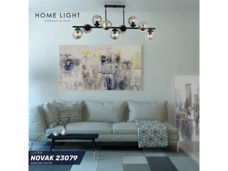 NOVAK 23079 – luster impozantnog izgleda, sastoji se od čak 9 staklenih kugli u kojima je sijalično grlo tip G9. Njegov raskoš izdvaja unikatan dizajn i spiralno raspoređene kugle u boji dimljenog stakla.