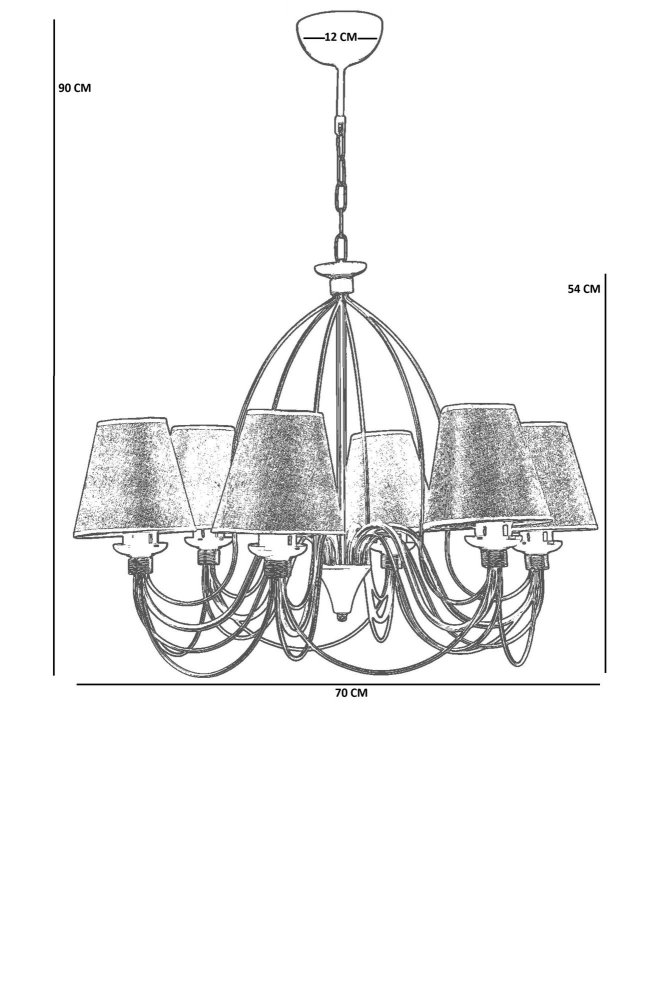 | Karakteristike | Luster Materijal lustera: Metal Materijal abažura: Tekstil Dimenzije: Ukupna visina: 90 cm Prečnik abažura: 9-16 cm Visina abažura: 16 cm Prečnik baze: 12 cm Visina baze: 7 cm Broj izvora svetlosti: 6 Tip sijaličnog grla: E14 Specifikacije osvetljenja: E14 6x max 40W Radni napon: 220-240 V IP zaštita: IP20 Ostalo: Podesiva visina Napomena: Sijalice nisu uključene u pakovanje |