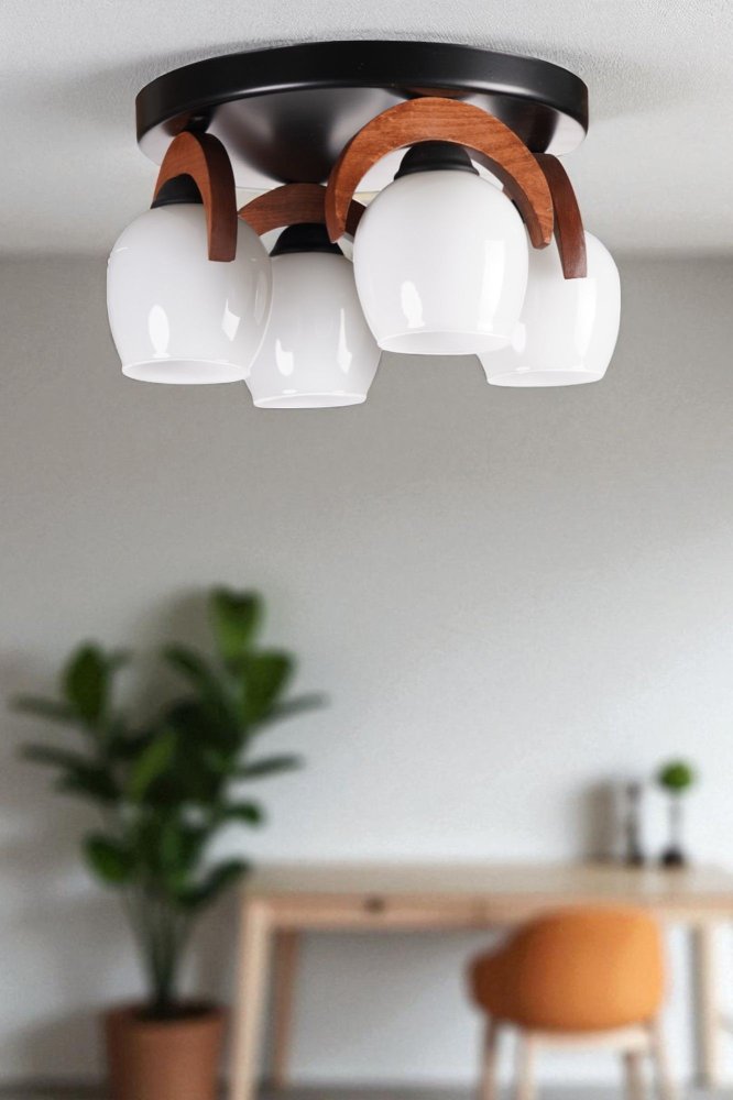 | Karakteristike | Luster Materijal lustera: Metal sa drvenim detaljima Materijal abažura: Staklo Dimenzije: Ukupna visina: 21 cm Prečnik abažura: 12 cm Visina abažura: 15 cm Prečnik baze: 30 cm Visina baze: 3 cm Broj izvora svetlosti: 4 Tip sijaličnog grla: E27 Specifikacije osvetljenja: E27 4x max 40W Radni napon: 220-240 V IP zaštita: IP20 Napomena: Sijalice nisu uključene u pakovanje |