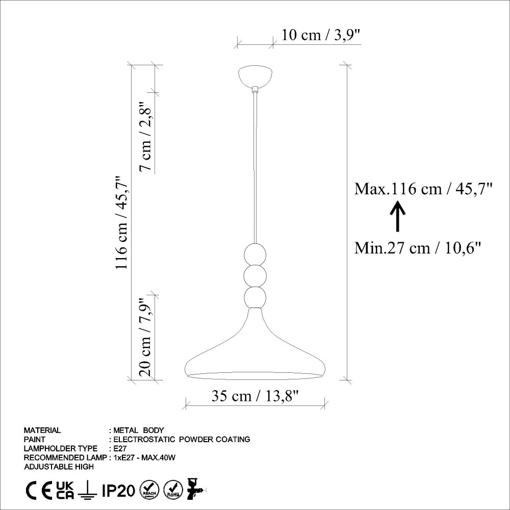 | Karakteristike | Luster bela - hrast boja Eysan 101 Ahsap METALNO KUĆIŠTE Metalni poklopac Veličina poklopca: Ø35 v:20 cm Ukupna visina: 27 - 116 cm Veličina osnovne ploče: Ø10 v:7 cm Podesiva visina Tip grla: 1 x E 27 Maks. 40 W Sijalica nije uključena 220-240 V IP kod: IP20 Broj pakovanja: 1 37 x 37 x 25 cm / 1,37 kg (1 komad) |