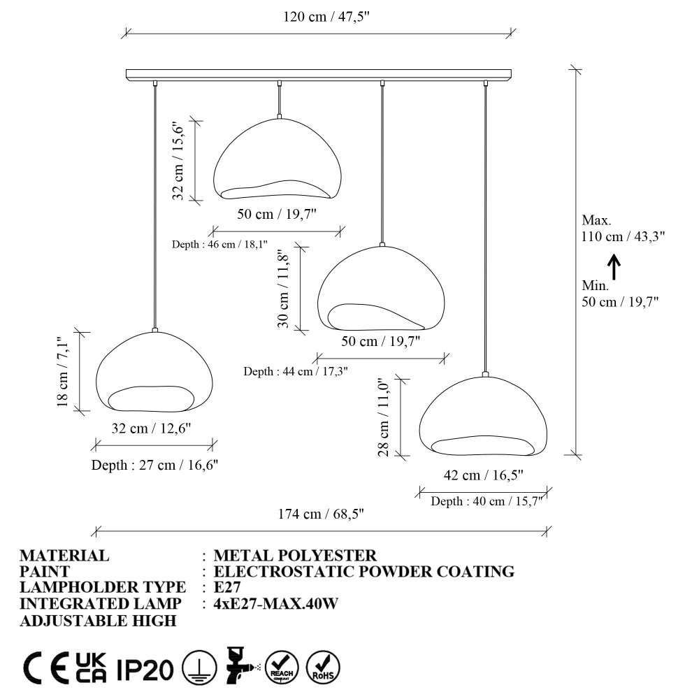 | Karakteristike | Luster Loval Set Lora 50 4 C Nua METALNO TELO Poklopac od fiberglasa Mali poklopac: 32 x 27 x 18 cm Srednji poklopac: 42 x 40 x 28 cm Veliki poklopac: 50 x 44 x 30 cm Veći poklopac: 50 x 46 x 32 cm Ukupna visina: 50 - 115 cm Veličina osnovne ploče: 120 x 6 x 4 cm Podesiva visina Tip grla: 4 x E 27 Maks. 40 W Sijalica nije uključena 220-240 V IP kod: IP20 Broj pakovanja: 1 140 x 42 x 40 cm / 17.400 kg (1 komad) |