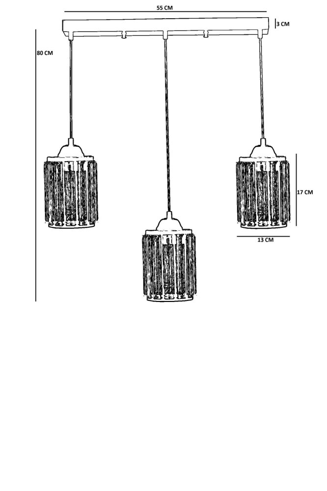 | Karakteristike | Luster Materijal lustera: Metal Materijal abažura: Staklo Dimenzije: Ukupna visina: 80 cm Prečnik abažura: 13 cm Visina abažura: 17 cm Dimenzije baze: 55 x 6 cm Visina baze: 3 cm Broj izvora svetlosti: 3 Tip sijaličnog grla: E27 Specifikacije osvetljenja: E27 3x max 40W Radni napon: 220-240 V IP zaštita: IP20 Ostalo: Podesiva visina Napomena: Sijalice nisu uključene u pakovanje |