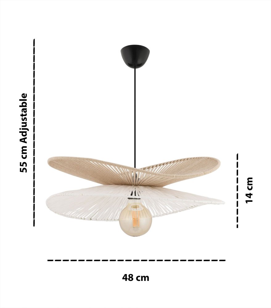 | Karakteristike | Luster Materijal kućišta: Metal Materijal abažura: Juta Dimenzije: Ukupna visina: 24 - 55 cm Prečnik abažura: 48 cm Visina abažura: 14 cm Prečnik baze: 7 cm Visina baze: 10 cm Broj izvora svetlosti: 1 Tip sijaličnog grla: E27 Specifikacije osvetljenja: E27 1x max 40W Radni napon: 220-240 V IP zaštita: IP20 Dodatne funkcionalnosti: Podesiva visina Napomena: Sijalica nije uključena u pakovanje |