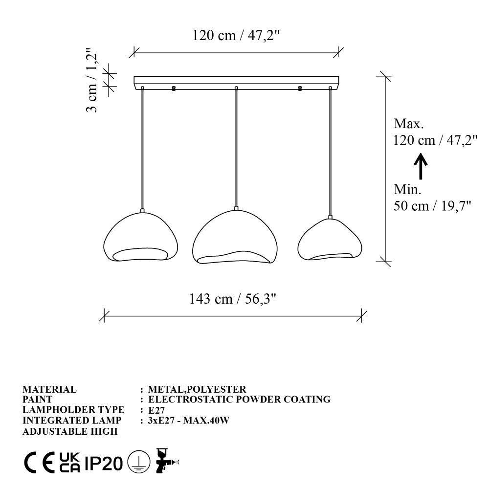 | Karakteristike | Luster Materijal kućišta: Metal Materijal abažura: Fiberglas Dimenzije: Ukupna visina: 80 - 115 cm Dimenzije malog abažura: 32 x 28 x 22 cm Dimenzije srednjeg abažura: 40 x 38 x 25 cm Dimenzije velikog abažura: 50 x 46 x 32 cm Dimenzije baze: 120 x 6 cm Visina baze: 4 cm Broj izvora svetlosti: 3 Tip sijaličnog grla: E27 Specifikacije osvetljenja: E27 3x max 40W Radni napon: 220-240 V IP zaštita: IP20 Dodatne funkcionalnosti: Podesiva visina Napomena: Sijalice nisu uključene u pakovanje |