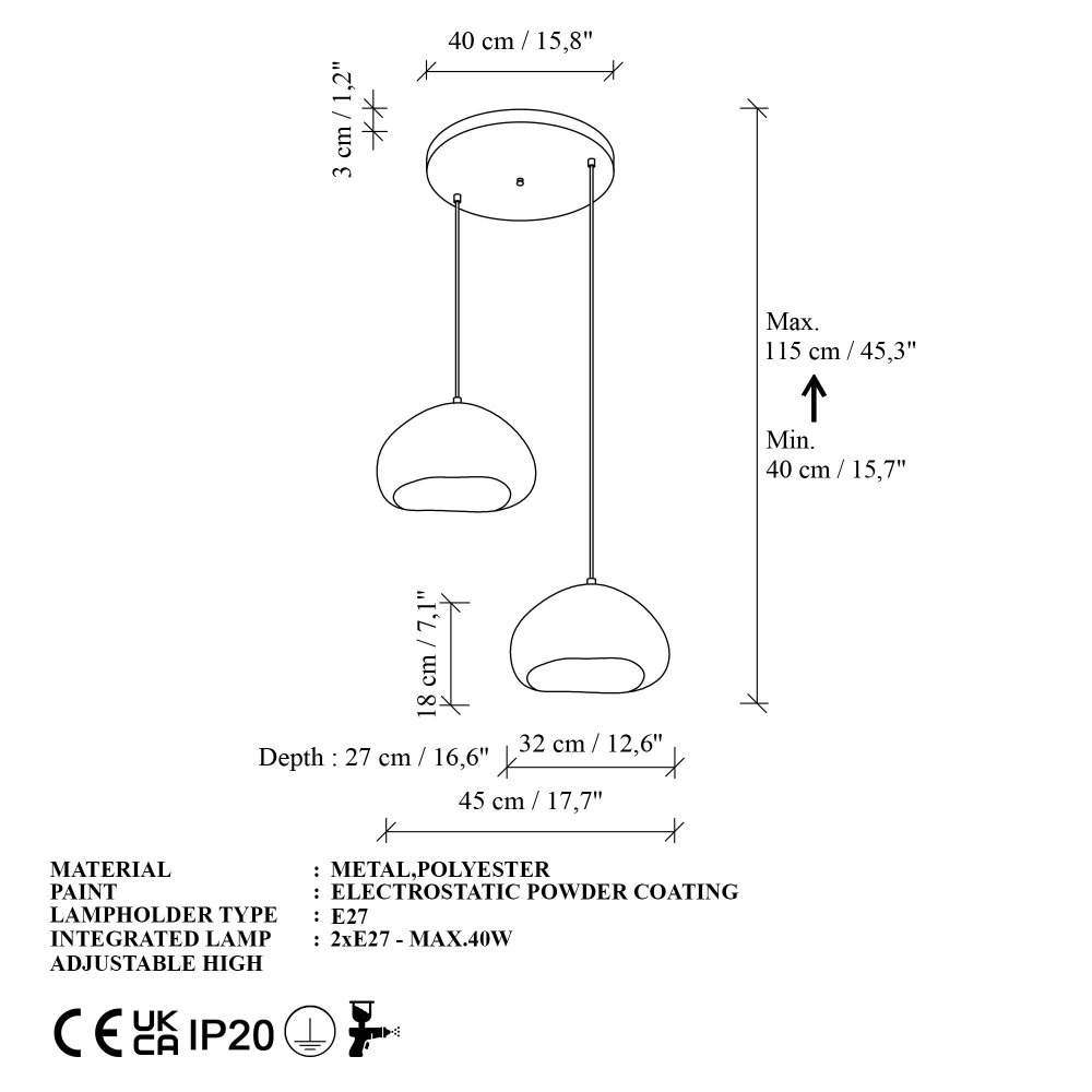 | Karakteristike | Luster Materijal kućišta: Metal Materijal abažura: Fiberglas Dimenzije: Ukupna visina: 35 - 106 cm Dimenzije abažura: 27 x 32 x 18 cm Prečnik baze: 40 cm Visina baze: 3 cm Broj izvora svetlosti: 2 Tip sijaličnog grla: E27 Specifikacije osvetljenja: E27 2x max 40W Radni napon: 220-240 V IP zaštita: IP20 Dodatne funkcionalnosti: Podesiva visina Napomena: Sijalice nisu uključene u pakovanje |