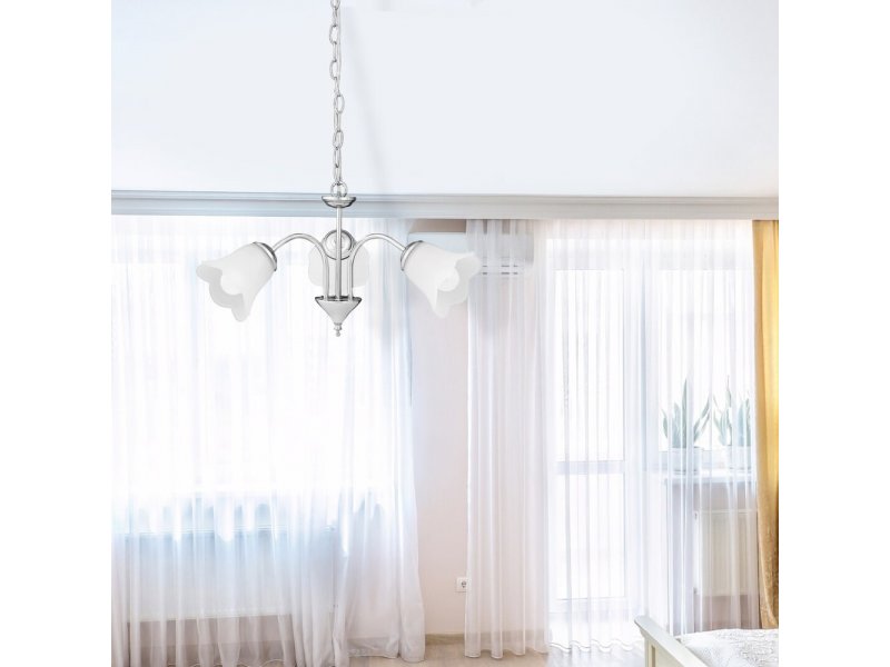 | Karakteristike | Materijal: Metal/Staklo Karakteristike: Broj grla: 3 Vrsta grla: E14 Specifikacije osvetljenja: E14 3 x MAX 40 W Primenjena voltaža: 230 V, 50 Hz Boja: Siva Dimenzije: Udaljenost od stropa: 90 cm Prečnik abažura: 60 cm Masa: 1.75 kg Pakovanje: Dimenzije pakovanja: 27 x 24 x 26.7 cm Bruto masa: 2.35 kg |