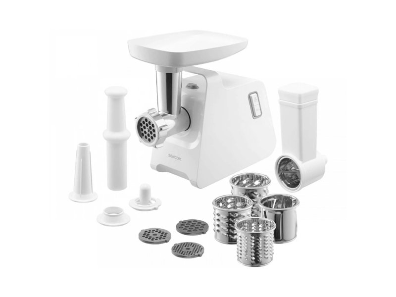 | Karakteristike | Kapacitet mlevenja: oko 100 kg mesa na sat Mlevenje mesa: brzo i jednostavno mlevenje raznih vrsta mesa. Tri diska za mlevenje: Ekstra fino – 3 mm Fino – 5 mm Grubo – 7 mm omogućavaju izbor željene teksture mlevenog mesa. Oštrice i diskovi: izrađeni od izdržljivog čelika. Dodaci: nastavak za pravljenje kobasica Protiskivač hrane: omogućava bezbedno guranje mesa u uređaj. Protivklizne nogice: stabilnost tokom rada. Rezanje i seckanje: tanko i fino sečenje. Ribanje i grubo usitnjavanje Snaga 1400 W. Boja: bela. |