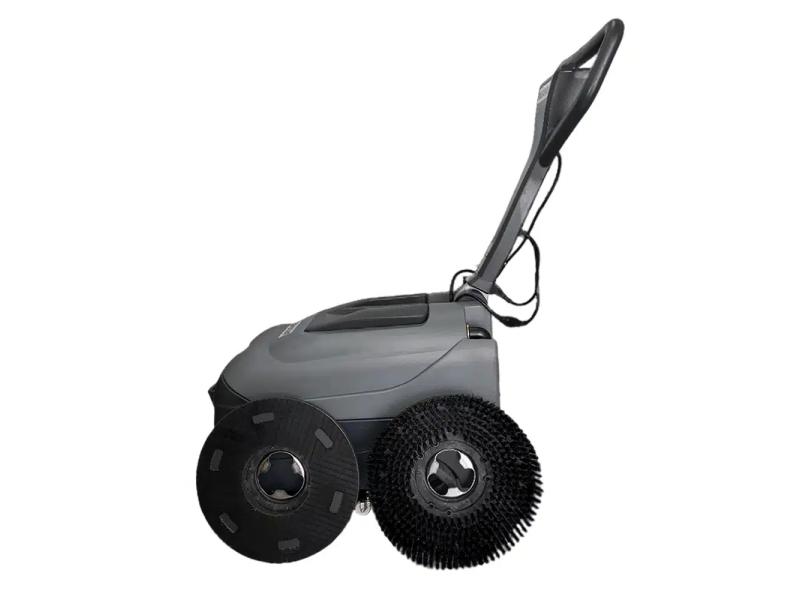 | karakteristike | Radni zahvat: 380 mm Kapacitet pranja: 1500 m²/h Rezervoar čiste vode: 14 l Rezervoar prljave vode: 18 l Brzina: 0-4 km/h Maksimalni uspon: 3% Pritisak četke/diska na podlogu: 20 kg Prečnik četke/diska: 380 mm Snaga motora usisivača: 700 W Snaga motora četke: 600 W Napajanje: 220 V Dimenzije: 570 x 930 x 1080 mm Dužina usisne grane: 550 mm Težina mašine: 48 kg |