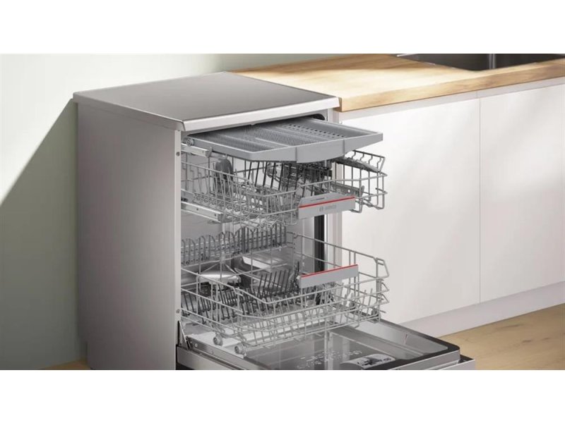 | Ostalo | Karakteristike Tip motora: EcoSilence Drive Potrošnja vode po ciklusu: 9 l Potrošnja električne energije na 100 ciklusa: 65 kWh Trajanje programa: 3h 35 min Nivo buke: 40 dB Klasa emisije buke: B Interval odloženog starta: do 24h Način sušenja: Zeolith, Izmjenjivač toplote Sistem korpi: Praktično punjenje sa Flex korpom Funkcije Funkcija Home Connect: Daljinsko praćenje i upravljanje Dodatne funkcije preko aplikacije Home Connect: Higijena Plus, Tišina na zahtev Polovično punjenje varioSpeed Plus Machine Care Senzor za vodu i količinu posuđa Detektovanje deterdženta AquaStop Dečiji sigurnosni sistem Programi Eco program Auto 45-65°C Intenzivno 70ºC Kratko 60°C Tih rad Prilagođeni program |