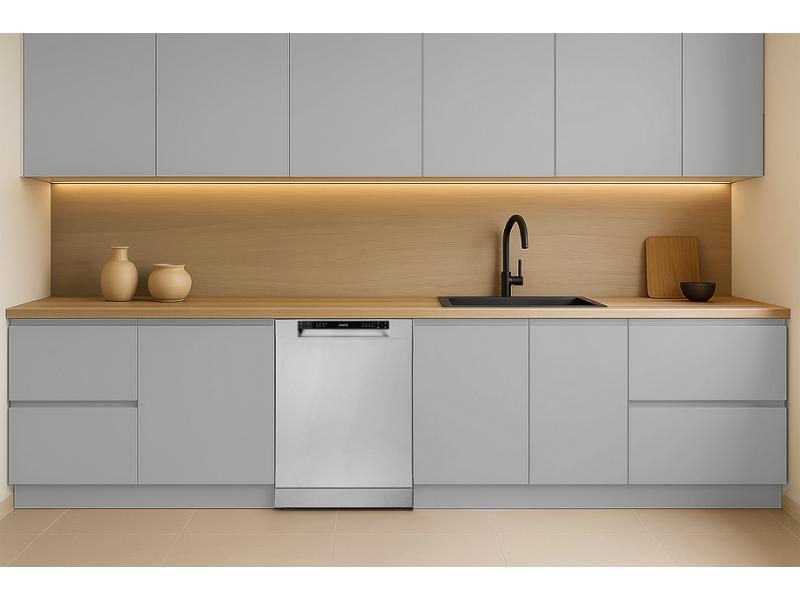 Ova veš mašina obezbeđuje prostor za 12 kompleta posuđa u dve velike korpe i korpu đeladi, koja se nalazi u donjoj korpi. Zahvaljujući izuzetno tihom radu od samo 47 dB, mašinu možeš bez brige smestiti i u kuhinju otvorenog koncepta, bez narušavanja mira tvog dnevnog boravka.