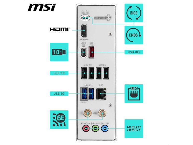 | Ostalo | Skladišni interfejs SATA priključci (ukupno): 4 SATA priključci: 4x SATA 6GB/s Broj M.2 slotova: 2 Podržani M.2 formati: 2x 2260 / 2280 (podrška za PCIe 4.0 x4 mod) RAID: RAID 0, RAID 1, RAID 10 Mreža Žična mreža (LAN): 2.5GBase-T (Gigabit) Model: Realtek 8125D Wi-Fi standard: Wi-Fi 6E Bluetooth verzija: 5.3 Priključci na zadnjem panelu Broj DisplayPort priključaka: 1 DisplayPort priključci: 1x DisplayPort 1.4 Broj HDMI priključaka: 1 HDMI priključci: 1x HDMI 2.1 Ukupno USB priključaka: 6 USB-A priključci: 2x USB 2.0, 4x USB 5Gbps (3.2 Gen 1) RJ-45 (LAN): 1 Audio: 3x 3.5mm Ostali priključci: BIOS Flashback taster, 1x Clear CMOS dugme, Wi-Fi / Bluetooth Unutrašnji priključci Naponski priključci: 1x Power Connector (CPU_PWR), 1x Power Connector(ATX_PWR) USB-A: 4 x podrška za 1 USB 2.0 port, 2 x podrška za 1 USB 5Gbps port USB-C: 1 x podrška za 1 USB 5Gbps port Ostali priključci: 2x Front Panel (JFP), 1x Chassis Intrusion (JCI), 1x TPM pin header(Support TPM 2.0), 1x CPU Fan, 1x RGB LED connector (JRGB), 4 x EZ Debug LED, 3x Addressable V2 RGB LED connector (JARGB_V2), 2x System Fan, 1x Com Port (JCOM), 1x EZ Memory Detection LED, 1x Front Audio (JAUD) Napomena: Za iskorišćavanje određenih internih konektora potrebni su dodatni bracket-i ili priključci na kućištu Ostale karakteristike Podržane tehnologije: Core Boost, Extended Heatsink Design, Frozr AI Cooling, M.2 Shield FROZR Fizičke karakteristike Dimenzije: 243.84 x 226 mm Pakovanje: SATA kabl, EZ M.2 clip II Remover, 1x EZ M.2 clip II, 1x EZ Wi-Fi Antenna |