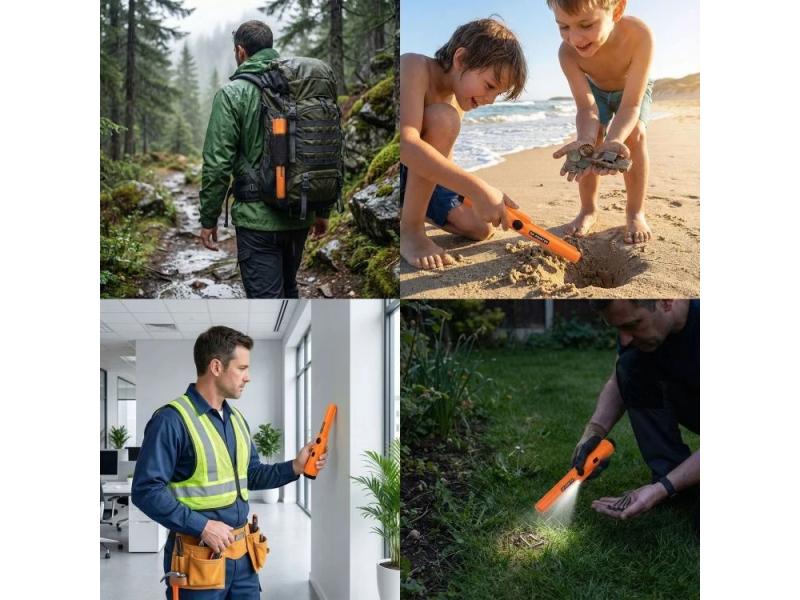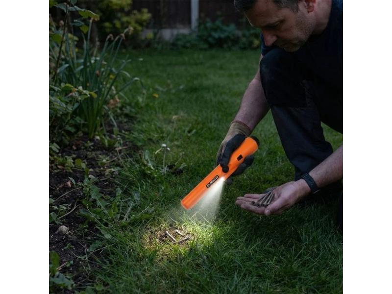 Ručni pinpointer je precizan alat za lociranje metala u iskopima, zidovima i šutu – idealan kao dopuna terenskom metal detektoru. Zahvaljujući kompaktnim dimenzijama i maloj težini, odlično se pokazuje u terenskim uslovima. Radi u statičkom režimu – zvučni i vibracioni signali se aktiviraju pri približavanju metalu. Detekcija od 360° i bočno skeniranje olakšavaju pretragu materijala. Poseduje IP66 zaštitu od vode i ugrađenu LED lampu, što omogućava rad u otežanim uslovima. U setu se nalaze futrola i traka za nošenje.