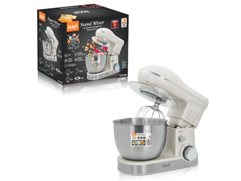 | Karakteristike | Funkcije: Mešenje testa, mućenje, mešanje Snaga: 1600 W Kapacitet: Posuda od 5 litara od nerđajućeg čelika Brzine: 6 nivoa brzine sa puls funkcijom Poklopac protiv prskanja Stabilnost: Neklizajuća baza za sigurnu upotrebu Napon: 220V |