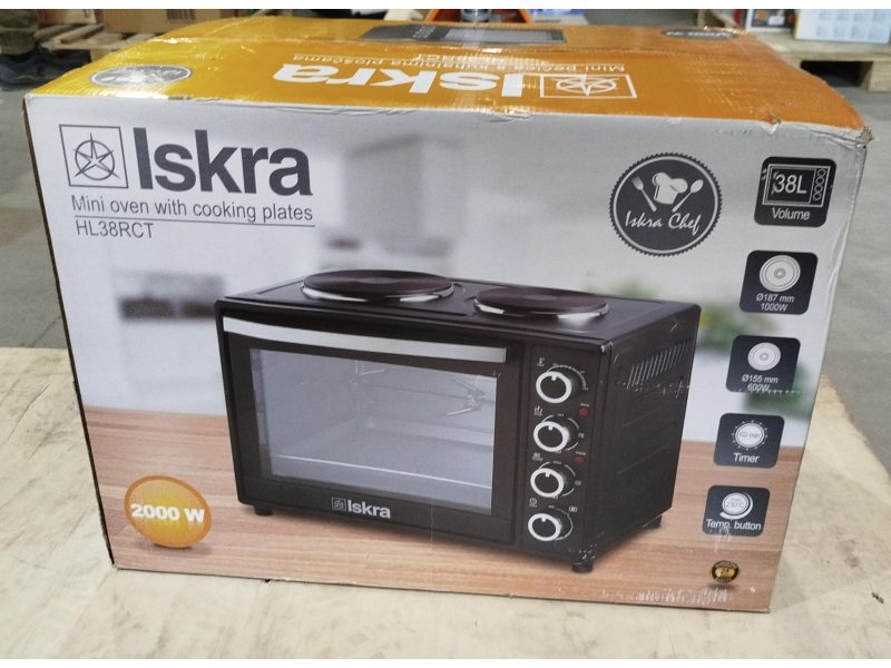 | Karatkeristike | Tip: Mini pećnica Napajanje: 220-240 V~ / 50-60 Hz Električne ploče Velika: 1000 W (prečnik 187 mm), mala: 600 W (prečnik 155 mm) Zapremina: 38 l Tajmer 60 min, sa alarmom Način rada rerna: gornji grejač + ražanj, donji grejač, oba grejača + ražanj; manja ringla, veća ringla, obe ringle istovremeno. Rernu i ringle nije moguće koristiti istovremeno. Temperatura: 100-230°C Pribor: tacna, rešetka sa držačem, ražanj za roštilj sa držačem Masa 11.11 kg |