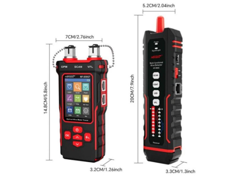 | Karakteristike | 10-u-1 dizajn. NF-859GT sveobuhvatni tester kablova kombinuje detekciju zice, testiranje poravnanja (testiranje mape zica), merenje duzine kabla, proveru PoE, testiranje uvijanja, treptanje portova, OPM (merac opticke snage), VFL (vizuelna lokacija greske), NCV (ne- ispitivanje kontaktnog napona) i lampe u jedan, prenosivi uredjaj. Jedan uredjaj za sve zadatke instalacije i odrzavanja mreze. Novi nadogradjeni prijemnik. Poboljsani novi prijemnik dolazi sa funkcijom Alignment Testing, omogucavajuci vam da bez napora obavite testiranje zicne karte na jednom mestu bez hodanja napred-nazad. Prijemnik takodje integrise funkcije VFL, PoE, detekcije zica, testiranja krimpovanja i osvetljenja. Podrska za razlicite tipove kablova. Obavlja precizno i brzo testiranje sirokog spektra tipova kablova, ukljucujuci RJ11, RJ45, CAT5e/CAT6/CAT6a, telefonsku liniju, opticka vlakna i druge koji se obicno koriste u umrezavanju i telekomunikacijama. Ispitivanje duzine kabla. Podrzava merenja duzine kablova od 5 metara do 200 metara, obezbedjujuci da su kablovi iseceni i pravilno instalirani i smanjujuci gubitak i obezbedjujuci optimalne performanse. Dual-Head VFL (vizuelni lokator gresaka). Emituje snop energije od 10 mV na standardnoj talasnoj duzini od 650 nm sa brzim i sporim treptajucim režimima za brzo i precizno otkrivanje kvarova/prekida/savijanja u kablovima sa optickim vlaknima. VFL znacajno smanjuje vreme potrebno za pronalacenje i dijagnostikovanje problema sa optickim vlaknima, sto dovodi do brzih popravki i manje zastoja. 7 Merac opticke snage talasne duzine (OPM). Meri 7 standardnih talasnih duzina (850/1300/1310/1490/1550/1625/1650) sa opsegom detekcije snage od -70 / +10 dBm, sto ga cini pogodnim za razlicite opticke mreze i aplikacije. PoE provera. Brzo proverite tip opreme za izvor napajanja (PSE), standard IEEE802.3af ili 802.3at i testirajte informacije o standardnim/nestandardnim PoE uredjajima, ukljucujuci napon napajanja, polaritet napajanja, rezim ukrstanja i jos mnogo toga, osiguravajuci da napajanje preko Etherneta (PoE) uredjaji primaju ispravan napon i struju. Hub treperi. Locirajte mrezne portove na cvoristima/prekidacima, kompatibilna sa brzinama od 10M/100M/1000M, sto pomaze u preciznom lociranju kablova i portova. Takodje, prikazace informacije o portu ukljucujuci radnu brzinu, dupleks rezim, podesavanja pregovaranja i svetla porta trepere na istom ekranu radi lakse identifikacije. NCV i lampe. NCV osigurava sigurnost sa mogucnostima beskontaktnog otkrivanja napona, a LED svetlom i litijumskom baterijom od 1500 mAh koja se moze puniti za rad u razlicitim okruzenjima. Funkcija detekcije zice: rezim protiv smetnji/obican rezim (koristi se sa drugim modelima) Test poravnanja: Lokalni test poravnanja i daljinsko poravnanje Test crimping: Za testiranje da li su registrovani utikači RJ11 i RJ45 su pravilno presvuceni PoE jezgro žice za napajanje, srednji i krajnji raspon VFL: 10mv LED lampa: DA Indikacija baterije: DA Napajanje: 3.7V litijum polimer baterija Dimenzije prijemnika: 200x52x33mm |