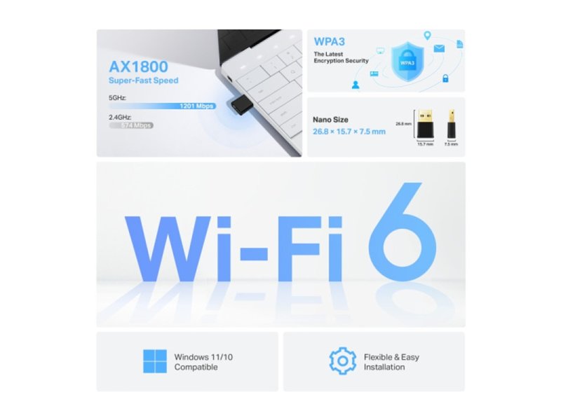 | Karakteristike | Uživajte u glatkom 4K video strimingu, igranju igara na mreži i iskustvima pregledanja veba uz TP-Link Archer TKS20U Nano AKS1800 bežični dvopojasni Wi-Fi USB adapter. Jednostavno povežite ovaj mali Wi-Fi 6 (802.11ak) adapter sa dostupnim USB-A portom vašeg računara za prenos do 1775 Mb/s preko opsega od 5 GHz i 2,4 GHz sa kompatibilnim mrežama. Beamforming, OFDMA i MU-MIMO tehnologije obezbeđuju efikasne, dalekosežne i pouzdane veze sa kompatibilnim uređajima. WPA3 šifrovanje pomaže da vaša mreža bude bezbedna od uljeza. TP-Link Archer TKS20U Nano je dizajniran za rad sa Windows 10 i 11 laptop računarima i desktop računarima. MU-MIMO Doživite glatke video strimove, igru i otpremanje dok vaša mreža istovremeno obrađuje propusni opseg za više uređaja. OFDMA Radeći sa ruterom kompatibilnim sa Wi-Fi 6, vaš računar prima podatke u isto vreme kada i drugi uređaji u istom streamu, isporučujući veoma efikasne veze. Napredna bezbednost sa VPA3 WPA3 Wi-Fi bezbednosni protokol donosi poboljšanu sajber bezbednost u ličnim mrežama. Bezbednije šifrovanje u bezbednosti Wi-Fi lozinke i poboljšana zaštita od napada grubom silom se kombinuju da bi zaštitili vaš kućni Wi-Fi. Miniature Design Archer TKS20U Nano je dizajniran da bude što je moguće praktičniji. Sa svojom minijaturnom veličinom i elegantnim dizajnom, možete povezati Nano adapter na bilo koji USB port i ostaviti ga tamo, bilo da putujete ili kod kuće. Sistem Connection USBA (2.0) Wi-Fi Wi-Fi 6 (802.11ax); Dvopojasni (2,4 i 5 GHz) sa podrškom za MU-MIMO Broj antena 2 Postavljanje antene Unutrašnje Podržani IEEE standardi 802.11a, 802.11ac, 802.11ak, 802.11b, 802.11g, 802.11n WEP, WPA, WPA-PSK, WPA2, WPA2-PSK, WPA3 Kompatibilnost OS Windows 10 do 11 Propusnost 1775 Mb/s Ukupno 5 GHz: 1201 Mb/s 2,4 GHz: 574 Mb/s Osetljivost -94 do -59 dBm Transmit Pover 18,5 do 21,5 dBm Certifikati CE, FCC, RoHS Uslovi rada 32 do 104°F / 0 do 40°C pri vlažnosti od 10 do 90% Dimenzije 1,1 x 0,6 x 0,3" / 26,8 x 15,7 x 7,5 mm |