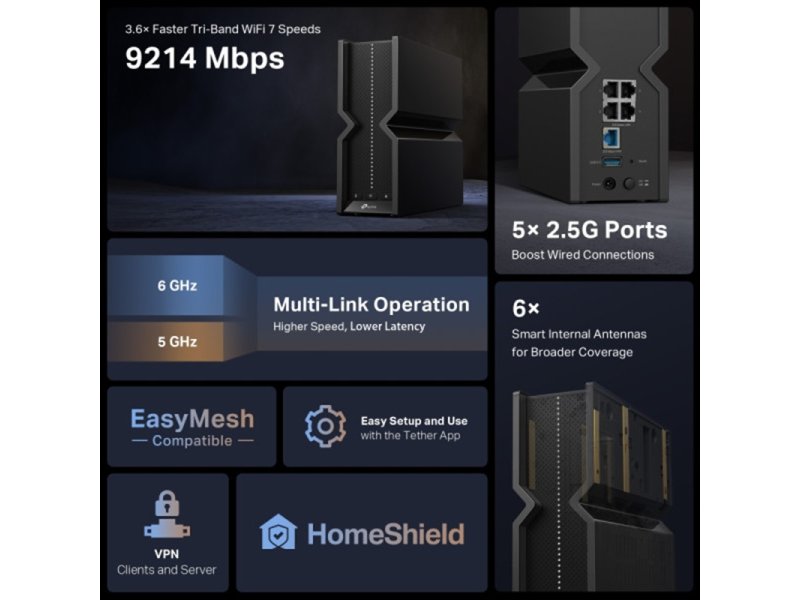 | Karakteristike | Redefinisanje WiFi rutera: Sa moćnim WiFi 7 performansama, munjevito brzim žičnim vezama i potpuno novim dizajnom. Izuzetno brzi 9214 Mbps Tri-Band WiFi 7: Omogućava vašim uređajima da rade punom brzinom. Uživajte u fluidnom 4K/8K strimovanju, impresivnom AR/VR igranju i izuzetno brzim preuzimanjima. Multi-link rad (MLO): Povećava propusnost, smanjuje latenciju i poboljšava pouzdanost za nove aplikacije. 5× 2.5G portova: 1× 2.5 Gbps WAN port i 4× 2.5 Gbps LAN porta probijaju 1G usko grlo, dovodeći vaše uređaje do vrhunskih performansi. Maksimalna pokrivenost: Patentirana WiFi optimizacija i optimalno pozicionirane antene, zajedno sa Beamforming-om, pružaju veći kapacitet, jače i pouzdanije veze i manje smetnji. Kompatibilno sa EasyMesh-om: Radi sa EasyMesh ruterima i proširivačima dometa kako bi se formirao besprekoran Mesh WiFi za celu kuću, sprečavajući padove i kašnjenje pri prelasku između signala. Jednostavno podešavanje i korišćenje: Upravljanje mrežom nikada nije bilo lakše uz aplikaciju Tether. Brzine WiFi-ja BE9300 6 GHz: 5760 Mbps (802.11be) 5 GHz: 2880 Mbps (802.11be) 2,4 GHz: 574 Mbps (802.11ax) Wi-Fi domet Kuće sa 4 spavaće sobe 6× Optimalno postavljene antene Više antena formira niz za pojačavanje signala kako bi pokrile više pravaca i velikih područja Formiranje snopa Koncentriše jačinu bežičnog signala prema klijentima kako bi proširilo WiFi domet FEM velike snage Poboljšava snagu prenosa kako bi se ojačala pokrivenost signalom Visok kapacitet WiFi-ja Tropojasni Dodelite uređaje različitim opsezima za optimalne performanse 2×2 MU-MIMO Istovremeno komunicira sa više MU-MIMO klijenata OFDMA Istovremeno komunicira sa više klijenata Pravednost vremena emitovanja Poboljšava efikasnost mreže ograničavanjem prekomerne zauzetosti DFS Pristupite dodatnom opsegu radi smanjenja zagušenja 6 Strimovi Povežite svoje uređaje sa većim propusnim opsegom Režimi rada • Režim rutera Režim pristupne tačke Napredne funkcije • Rad sa višestrukim linkovima (MLO) Kanal od 320 MHz 4K-QAM Višestruki RU-ovi Kompatibilno sa EasyMesh-om Radi sa Alexa-om i Google asistentom IoT mreža Bezbednost mreže • SPI zaštitni zid Kontrola pristupa Vezivanje za IP i MAC adrese Gejtvej sloja aplikacije HomeShield bezbednost IoT zaštita u realnom vremenu Blokator zlonamernih sajtova Sistem za sprečavanje upada Sprečavanje DDoS napada Skener kućne mreže Gost mreža • 1× 6 GHz gost mreža 1× 5 GHz gost mreža 1× 2,4 GHz gost mreža VPN server • OpenVPN server PPTP VPN server L2TP VPN server WireGuard VPN server VPN klijent • Open VPN klijent PPTP VPN klijent L2TP VPN klijent WireGuard VPN klijent WiFi šifrovanje • WPA WPA2 WPA3 WPA/WPA2-Enterprise (802.1x) HARDVERI Ethernet portovi • 1× 2,5 Gbps WAN 4× 2,5 Gbps LAN USB podrška 1× USB 3.0 Podržani formati particija: NTFS, exFAT, HFS+, FAT32 Podržane funkcije: FTP server Medijski server Samba server Dugmad • Dugme za uključivanje/isključivanje Dugme za uključivanje/isključivanje Wi-Fi-ja LED dugme WPS dugme Dugme za resetovanje Napajanje 12 V ⎓ 3,3 A Protokoli • IPv4 IPv6 Servisni komplet HomeShield Saznajte više> EasyMesh kompatibilan sa EasyMesh-om Roditeljski nadzor HomeShield roditeljski nadzor Prilagođeni profili Biblioteka profesionalnih filtera sadržaja Porodično vreme Vreme za spavanje Vreme van mreže Nagrade za vreme Rangiranje vremena provedenog na mreži u porodici Pauziranje interneta Nedeljni i mesečni izveštaji Tip WAN-a • Dinamička IP adresa Statička IP adresa PPPoE PPTP L2TP Kvalitet usluge QoS po uređaju Klaud usluga • Automatska nadogradnja firmvera TP-Link ID DDNS NAT prosleđivanje • Prosleđivanje portova Okidanje portova DMZ UPnP IPTV • IGMP proksi IGMP špijuniranje Most Tag VLAN DHCP • Rezervacija adrese DHCP lista klijenata Server DDNS • TP-Link NO-IP DynDNS Upravljanje • Tether aplikacija Veb stranica Sistemski zahtevi Internet Explorer 11+, Firefox 12.0+, Chrome 20.0+, Safari 4.0+ ili drugi pregledač sa omogućenim JavaScript-om Kablovski ili DSL modem (ako je potreban) Pretplata kod internet provajdera (za pristup internetu) Sertifikati CE, FCC, RoHS Okruženje • Radna temperatura: 0℃~40℃ (32℉ ~104℉) Radna vlažnost: 10%~90% bez kondenzacije FIZIČKE DIMENZIJE: Dimenzije (Š×D×V) 3,0 × 9,1 × 8,0 inča (76 × 231,7 × 203 mm) Sadržaj paketa • Wi-Fi 7 ruter Archer BE550 Adapter za napajanje RJ45 Ethernet kabl Vodič za brzu instalaciju |