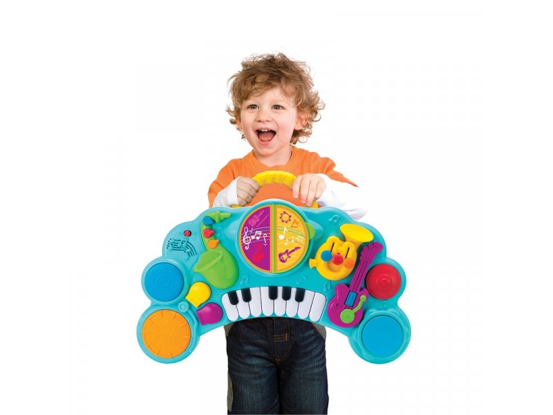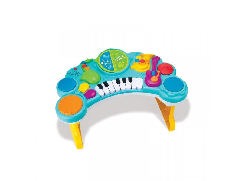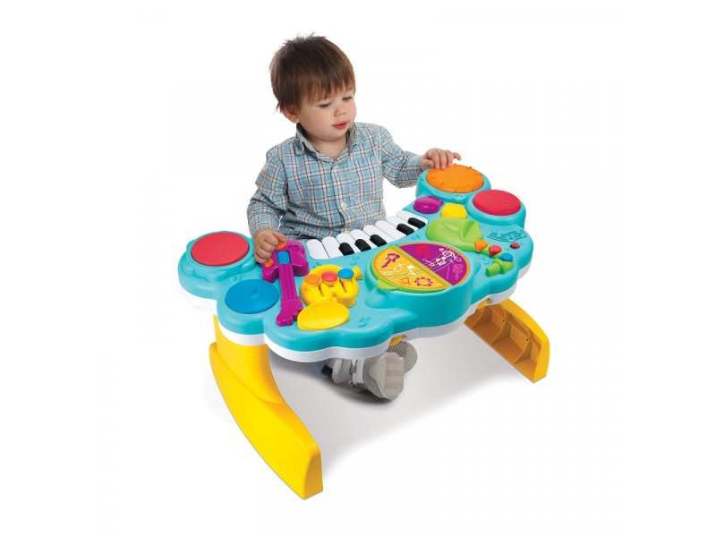 | Karakteristike | U samo jednoj igrački postoji 10 različitih instrumenata koji se mogu svirati, sa 10 različitih zvukova. Jarke i upečatljive boje na muzičkom klaviru razvijaju bebino čulo vida. Svaki instrument obojen je drugom prijatnom bojom, koje će privući bebinu pažnju. Knjiga koja se nalazi na klaviru produkovaće zvuk niza instrumenata, kao čitav simfonijski orkestar umetnika koji sviraju različite vrste instrumenata.Sa leve strane nalaze se polja koja će dodirom na njih emitovati zvukove instrumenata poput bubnjeva, saksofona. Sa desne strane nalaze se gitara, truba, bubanj. Igračka dolazi sa zasebnim postoljem za klavir, koje je podesivo po visini. Proizvod je napravljen od plastike bez BPA, što bebi omogućava apsolutnu sigurnost tokom igre. |