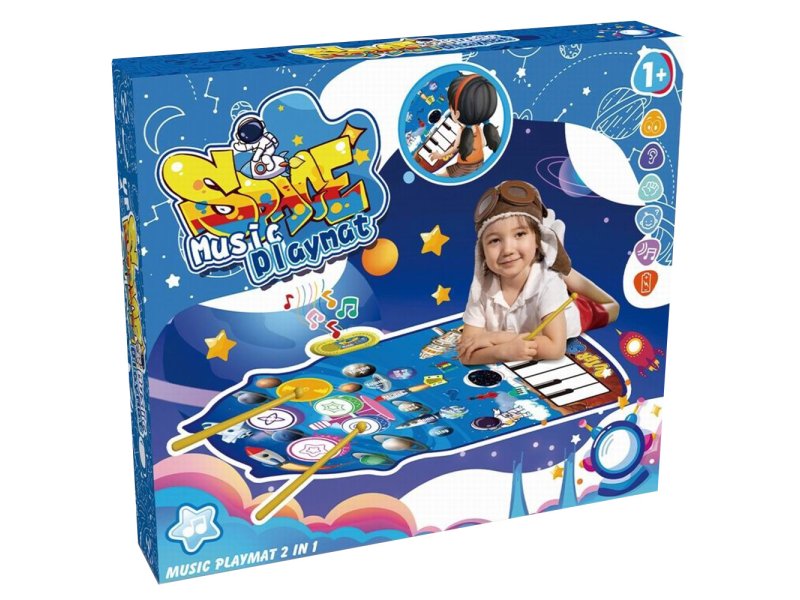Set sadrži muzički tepih na temu svemira sa klavijaturom, bubnjevima i muzičkim efektima, kao i dve palice za sviranje bubnjeva.