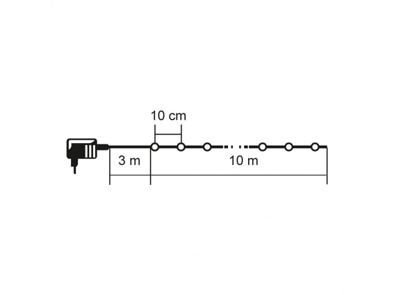 Svetlosni niz je opremljen zelenim kabelom dužine 10 metara, na koji je postavljeno ukupno 100 LED lampica na svakih 10 centimetara