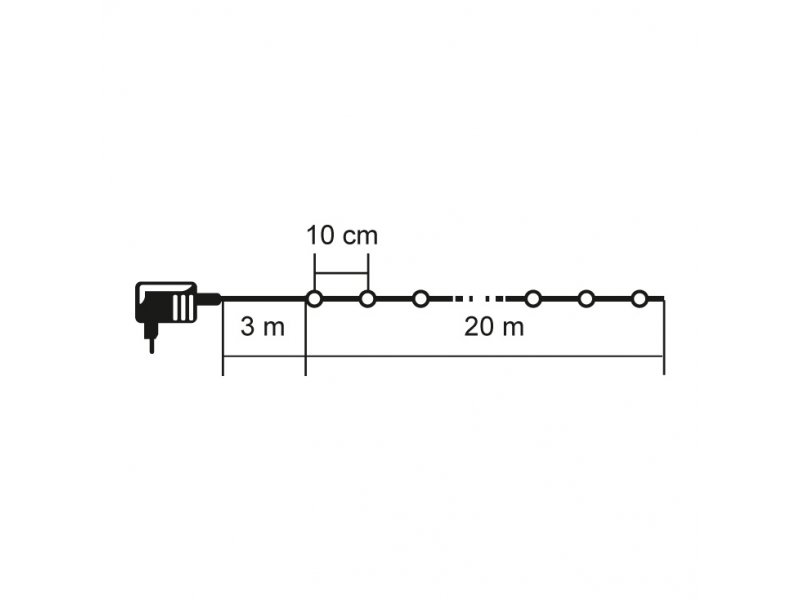 | Karakteristike | Napajanje 230 V~ (strujni adapter) Boja svetlosti Toplo bela Broj LED dioda 200 Dužina niza LED dioda 20 m Razmak između LED dioda 10 cm Prekidač Ne Boja kabela Zelena Upotreba Unutrašnja i spoljna |