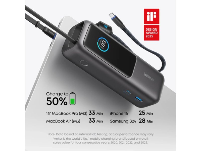 ANKER Power Bank 25000mAh, 165W, sa ugrađenim USB-C kablom na izvlačenje, crni