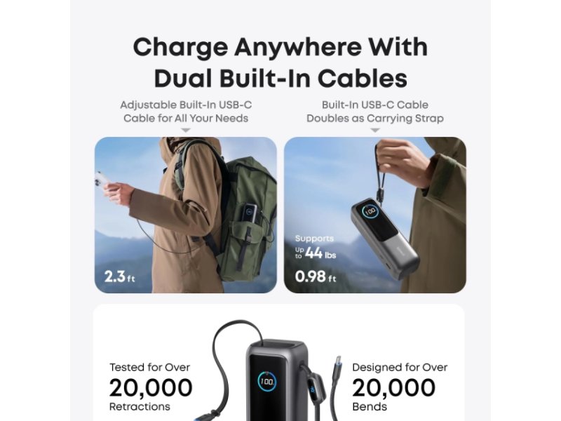 ANKER Power Bank 25000mAh, 165W, sa ugrađenim USB-C kablom na izvlačenje, srebrni