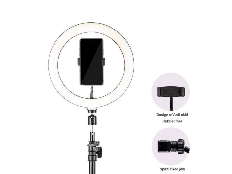 | Ostalo | Temperatura boje tri vrste svetala može se menjati kako bi se prilagodila različitim scenama, pružajući lepši efekat prilikom live prenosa i fotografisanja. Dužina držača je 72-210 cm, sa stabilnom strukturom stativa koji se može podešavati na različite visine. Fleksibilni rotirajući adapteri omogućavaju pregled telefona iz različitih uglova. Stezaljke su dizajnirane sa elastičnim silikonom kako bi obezbedile sigurnost i stabilnost uređaja, sprečavajući njegovo ispadanje. Držač koristi spiralni dizajn stezaljke, koji se može fiksirati jednim okretom, što je veoma praktično. Istaknuto: Trokutasti stativ sa LED svetlom za live prenose Ulazni napon: 5V Materijal: Metal + PC Podesiva visina: 72 cm - 210 cm Režimi osvetljenja: tri nivoa (toplo svetlo, hladno svetlo, blago svetlo) Prsten za popunjavanje svetla: 26 cm (10 inča) 120 lampica Jedan držač za mobilni telefon Držač je pogodan za mobilne telefone ispod 6 inča 360-stepeni podešavanje ugla svetla |