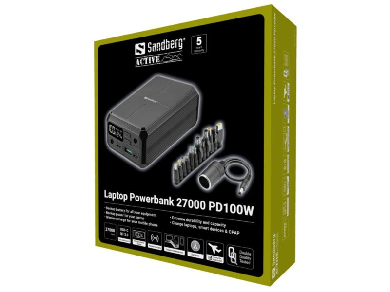 | Ostalo | Capacity: 27000 mAh / 99,9 Wh / 3.7V DC-port input: 12-24V/3A (72W max) DC-port output: 12V/5A, 16.5V/4A, 20V/3.5A, 24V/3.5A (84W max) USB-C PD input: 5V/3A, 9V/3A, 12V/3A, 15V/3A, 20V/3A (60W max) USB-C PD output: 5V/3A, 9V/3A, 12V/3A,15V/3A, 20V/5A (100W max) USB-A output: 4.5V/5A, 5V/4.5A, 9V/2A, 12V/1.5A (22.5W max) USB-C (2) output: 5V/3A, 9V/3A, 12V/2.5A (30W max) Wireless charger max: 10W Supports Pass-Through Charging: Yes. While DC is input, USB-C2 & USB-A can do output at the same time (15W max per port). DC5521 port standard Charge temperature: -10~45℃ Discharge temperature: -20~60℃ |