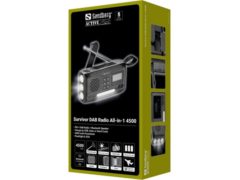 | Ostalo | Kapacitet: 4500 mAh /16,65 Wh / 3,7 V USB-A izlaz: 5 V/2 A USB-C ulaz: 5 V/2 A Približno vreme punjenja: AC punjačem 5 V/1,5 A (0-100%): 4 sata Solarnim panelom (0-25%): 20 sati Ručnom kurbom (0-25%): 5 sati Radio: DAB+: 170 - 240 MHz FM: 87,5 - 108,0 MHz Vreme reprodukcije: Do 20 sati kada se koristi samo radio Solarni panel: Tip: Polikristalni Napon: 5 V, 95 mA (0,48 W maks.) LED lampa: 1,5 W Intenzitet LED lampe: 90 lumena Snaga ručne kurble: 5 V, 380 mA (1,9 W maks.) Zvučnici: 3 W (maksimalna snaga) Blutut: 5.0 Radna temperatura: -10℃- 50℃ Specifikacije suvih baterija: 3xAAA baterije (nisu uključene) |