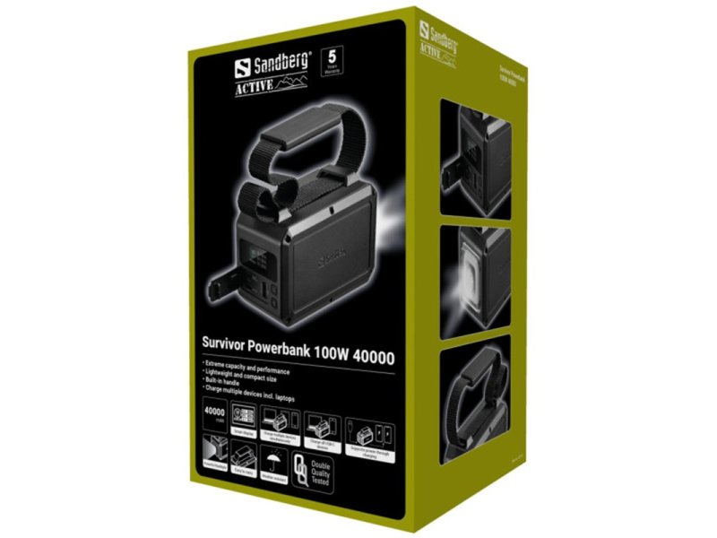 | Ostalo | Capacity: 40000 mAh / 154Wh / 3.85V (UN3480) IPX4 Water resistant LED Flashlight 120 lumen reach 12-15 meters lnput USB-C 1: 5V/3A, 9V/3A, 12V/3A, 15V/3A, 20V/3.25A (65W Max) Output USB-C 1: 5V/3A, 9V/3A, 12V/3A, 15V/3A, 20V/5A (100W Max) Output USB-C 2: 5V/3A, 9V/2.22A, 12V/1.67A (20W Max) Output USB-A: QC 3.0 5V/3A, 9V/2A, 10V/2.25A, 12V/1.5A (22.5W Max) USB-C1+USB-C2 Output: 65W+20W = 85W USB-C1+USB-A Output: 65W+22.5W = 87.5W USB-C1+USB-C2+USB-A Output: 65W+15W=80W Supports pass-through charging Charge temperature: 0~45℃ Discharge temperature: -20~60℃ Link Powerbank Sandberg SURVIVOR 421-14 40000mAh 100W |