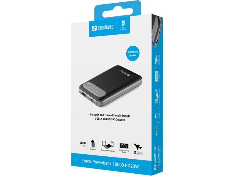 Ostalo | Sandberg Travel eksterna baterija 10000 PD20W je kompaktno i snažno rešenje za vaše potrebe punjenja dok ste u pokretu. Sa kapacitetom od 10000 mAh i izlazima za USB-A i USB-C, možete lako puniti svoje uređaje. Podržava punjenje do 20 W i ima praktičan digitalni ekran koji prikazuje status baterije. Savršeno za održavanje vaših uređaja u radu, bez obzira na to gde se nalazite. Kapacitet: 10000 mAh / 3.85V / 38.5 Wh Tip baterije: Li-polymer USB-C input: 5V/3A, 9V/2A USB-C output: 5V/3A, 9V/2.22A, 12V/1.67A (PD20W) USB-A output: 5V/4.5A, 9V/2A, 12V/1.5A (22.5W) LCD displej za status preostalog kapaciteta baterije |
