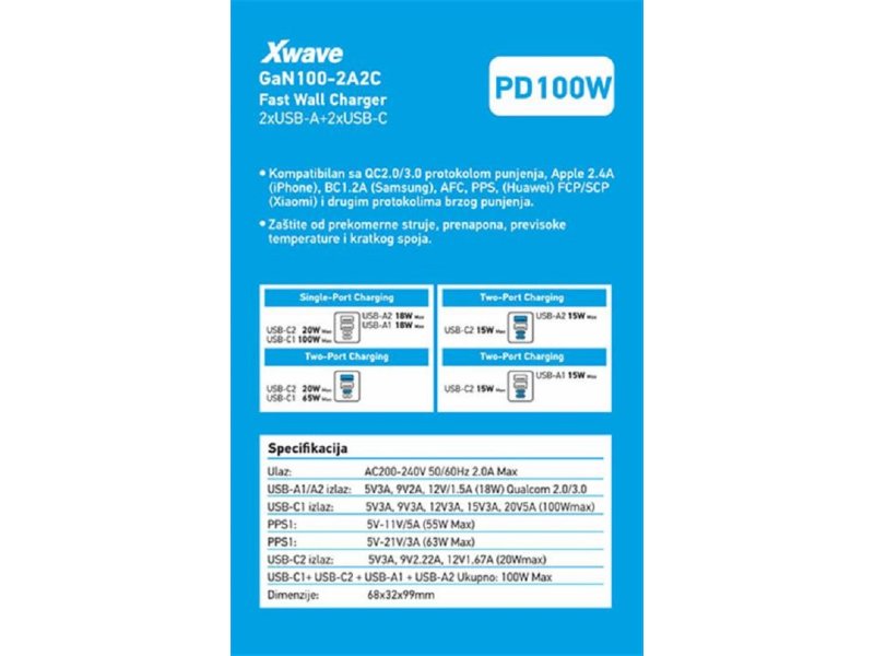 | Ostalo | Ulaz: AC200-240V 50/60Hz 2.0A max USB-A1/A2 izlaz: 5V3A, 9V2A, 12V/1.5A (18W) Qualcom 2.0/3.0 USB-C1 izlaz: 5V3A, 9V3A, 12V3A, 15V3A, 20V5A (100Wmax) PPS1: 5V-11V/5A (55W max) PPS1: 5V-21V/3A (63W max) USB-C2 izlaz: 5V3A, 9V2.2A, 12V1.67A, (20Wmax) USB-C1+ USB-C2+USB-A1+USB-A2 ukupno: 100W max Dimenzije kućišta: 68 x 32 x 99 mm Opis: Kompatibilan sa QC2.0/3.0 protokolom punjenja, Apple 2.4A (iPhone), BC1.2A (Samsung), AFC, PPS, (Huawei) FCP/SCP (Xiaomi) i drugim protokolima brzog punjenja Zaštite od prekomerne struje, prenapona, previsoke temperature i kratkog spoja Vatrootporno plastično kućište |