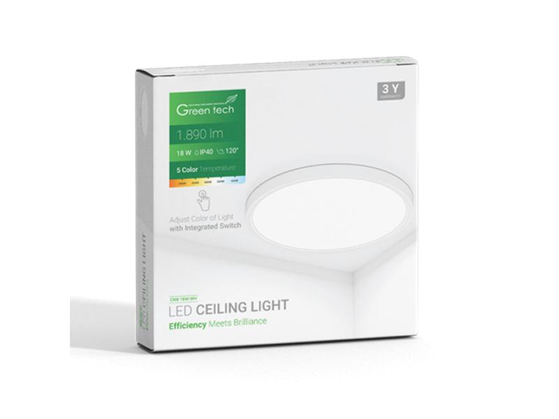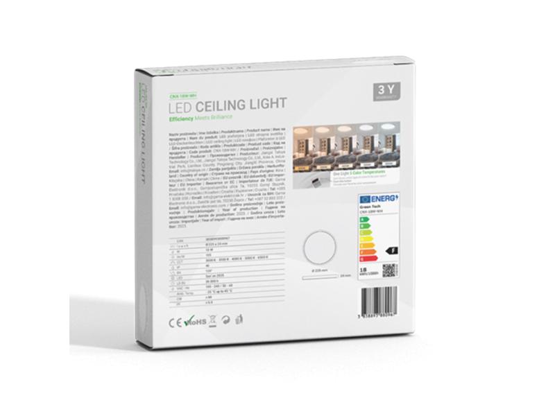 | Specifikacija | Snaga: 18 W Boja svetlosti: 5 CCT 3000K-3500K-4000K-5000K-6500K (odabir boje svetlosti pomoću prekidača na zadnjoj strani proizvoda) IP stepen zaštite: IP40 Napon: AC 100 - 240 V / 50 - 60 Hz Flux: 105 lm / W Ukupan tok svetlosti: 1890 lm Ugao svetlosti: 120° LED diode: San`an 2835 Radna temperatura: od -25°C do 45°C Vek trajanja: 30000 radnih sati CRI ≥ 80 PF ≥ 0.5 Sertifikati: CE, RoHS Materijal: Plastika Boja artikla: Bela Neto težina: 0,490 kg Bruto težina: 0,510 kg Dimenzije artikla: Ø 225 x 24 mm Dimenzije pakovanja: 230 x 230 x 30 mm |