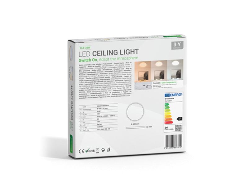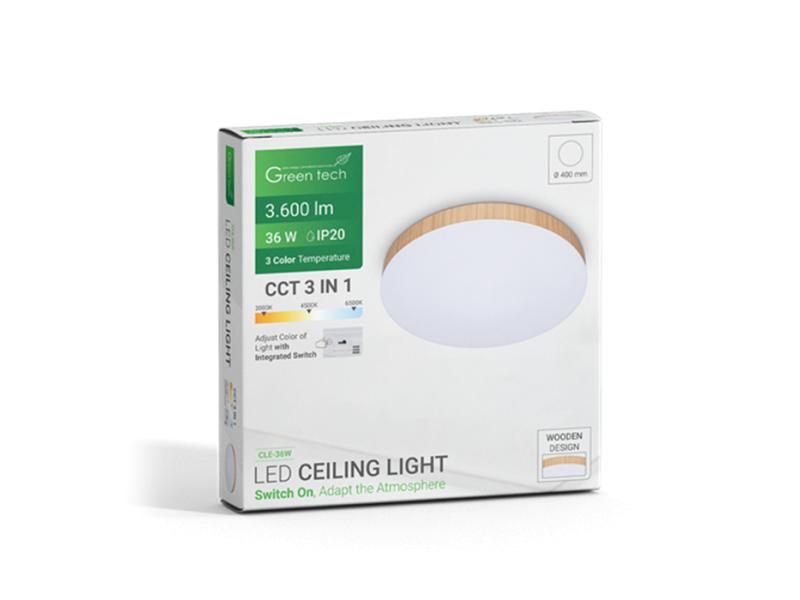| Specifikacija | Snaga: 36 W Boja svetlosti: 3000 K - 4500 K - 6500 K Odabir boje svetlosti pomoću integrisanog prekidača IP stepen zaštite: IP20 Napon: AC 220 - 240 V / 50 - 60 Hz Flux: 100 lm / W Ukupan tok svetlosti: 3600 lm Ugao svetlosti: 180° Vek trajanja: 10 000 radnih sati Sertifikati: CE, RoHS Materijal: Plastika Boja artikla: Bela + drveni detalji Neto težina: 0,810 kg Bruto težina: 1,120 kg Dimenzije artikla: Ø 400 x 42 mm Dimenzije pakovanja: 408 x 55 x 408 mm |