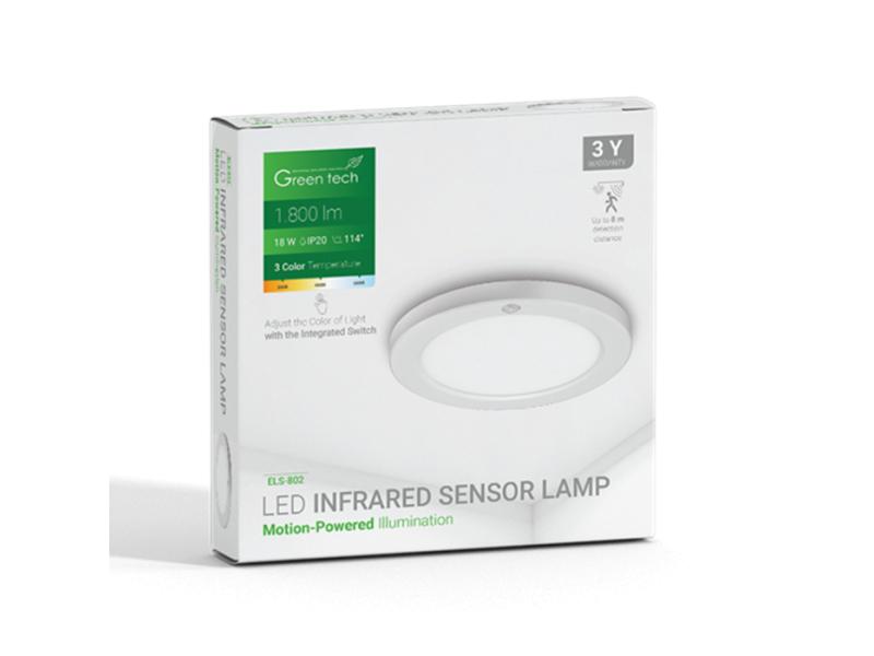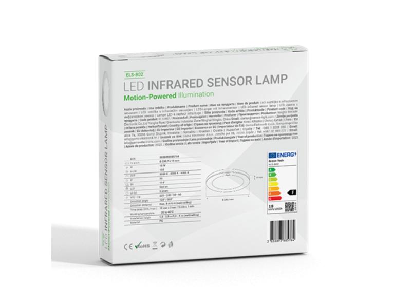 | Specifikacija | Snaga: 18 W Boja svetlosti: 3000 K - 4000 K - 6000 K Boja svetlosti se bira pomoću prekidača IP stepen zaštite: IP20 Napon: AC 220 - 240 V / 50 - 60 Hz Flux: 1800 lm Svetlosna efikasnost: 100 lm / W Ugao svetlosti: 114° Raspon detekcije: 120° / 360° Infracrveni senzor pokreta Domet detekcije: max 8 m / 6 m (zid/plafon) Vreme odgode (min/max): 10 sec / 5 min 3 načina montaže: Zidna +plafonska + ugradna Zidna montaža: 1,8 - 2,5 m; plafonska montaža: 2,2 - 4 m Vek trajanja: 5 godina Sertifikati: CE, RoHS Materijal: Plastika Boja artikla: Bela Neto težina: 0,405 kg Bruto težina: 0,520 kg Dimenzije artikla: Ø 230,7 x 19 mm Dimenzije pakovanja: 238 x 44 x 238 mm |